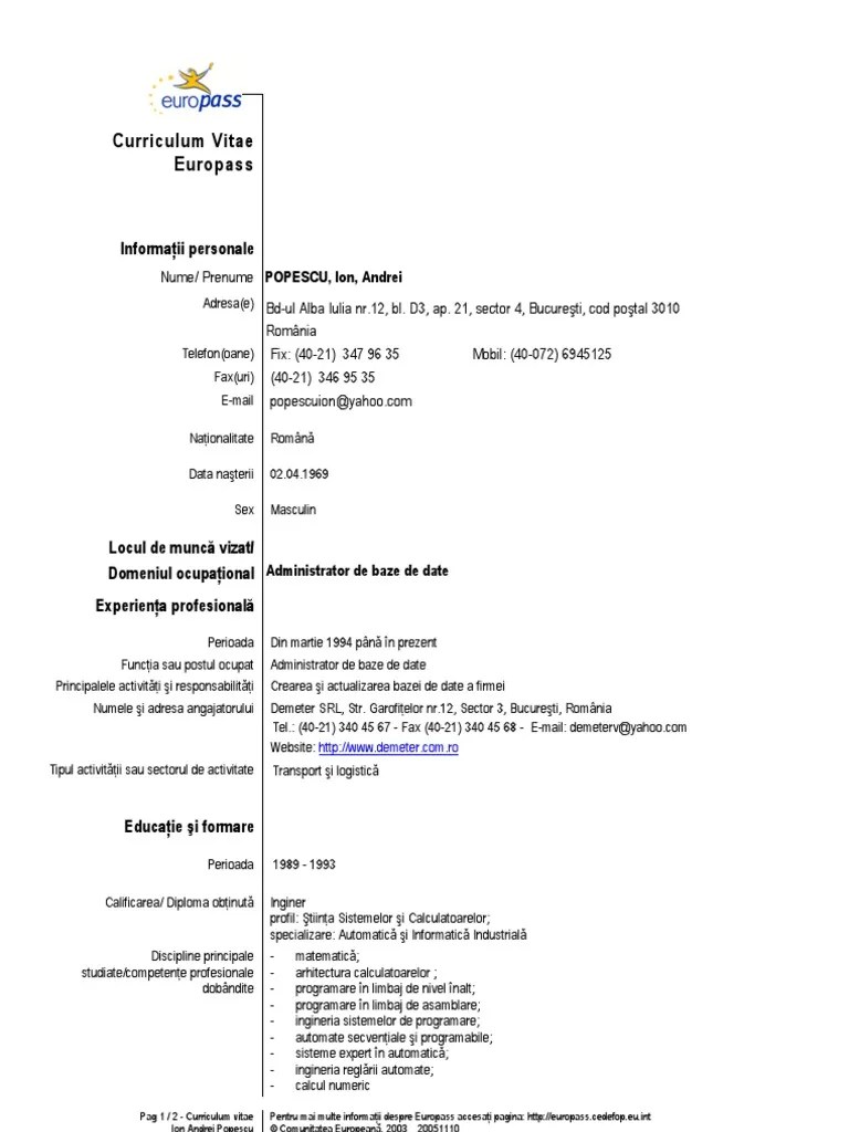 Cel mai utilizat curriculum vitae este modelul european europass dar si cel. In sectiunea de mai jos gasesti gratuit pentru download un model de cv obisnuit necompletat. Curriculum vitae europass model completat romana. Probabil că ai auzit deja de modelul de cv europass,. Nume / prenume, nume, prenume (rubrică .